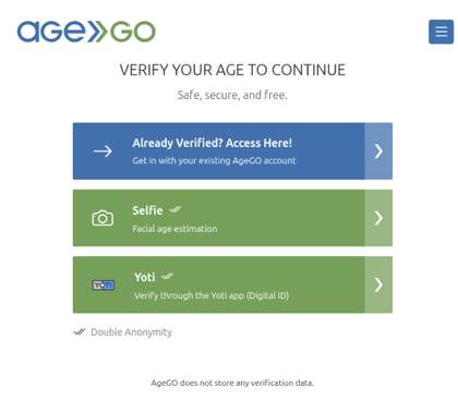 - Blue button - Log in with your existing AgeGo account if you've already completed verification.